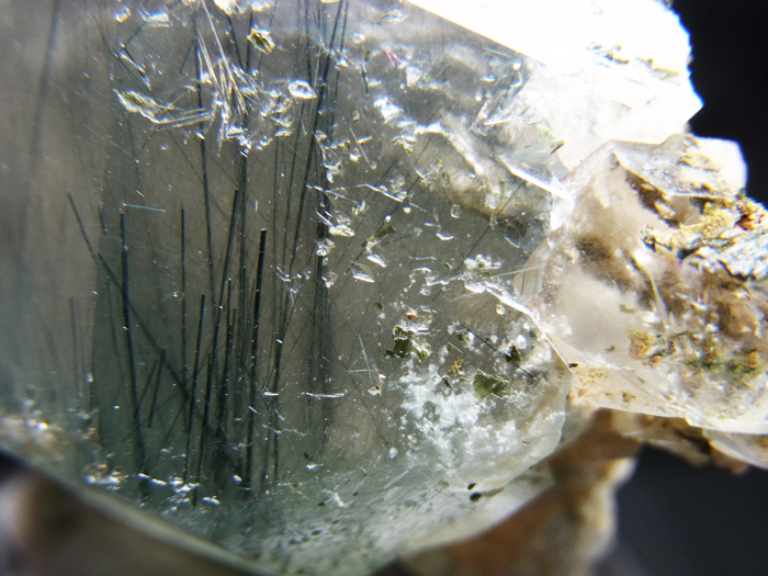 ▲▼ 長いリーベカイトが沢山入っています。表面付近の内外にパラパラと見られる緑色の短い内包物がエジリンです。
