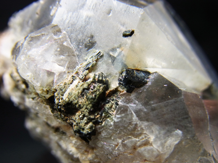 ▲▼ エジリンがこの辺りに集中してついています。水晶表面の不思議な形の小さな穴のほとんどはこのエジリンや他の鉱物の痕跡だと思います。