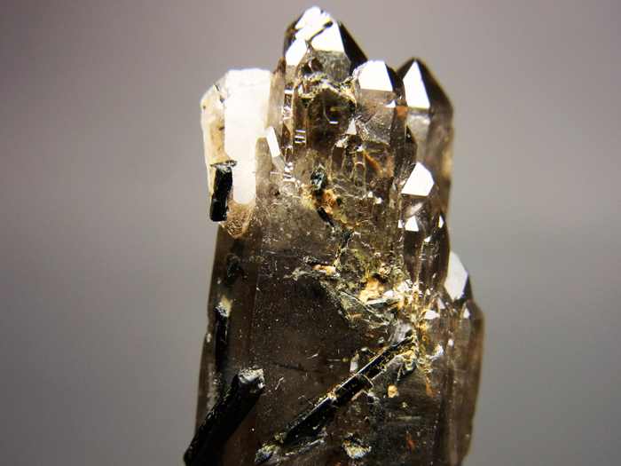 個性的で可愛らしい、両錐のエジリン付きスモーキークォーツです。トップ画像上側のポイントには大きなレコードキーパーがたくさん付いていて、根元側はポイントがイカの足の様に相当数に分裂し、寄り添ってやや斜めにそびえ立っています。根元側ポイントのワイルドで重厚な佇まいが、立ち並ぶお城の塔の様でとても格好良いです。洗練された可愛らしさと格好良さが同居した、個性溢れる秀逸な標本です。