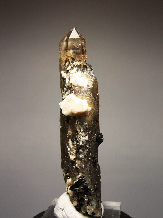 大小様々なサイズのエジリンが全体に散りばめられた、透明感のある長身のマラウイ産スモーキークォーツです。トップには真っ白なエピディディマイトの筋と繊維状のインクルージョンが見られ、柱面には僅かながらもジルコンの群晶が付着した、当産地らしい賑やかな標本です。